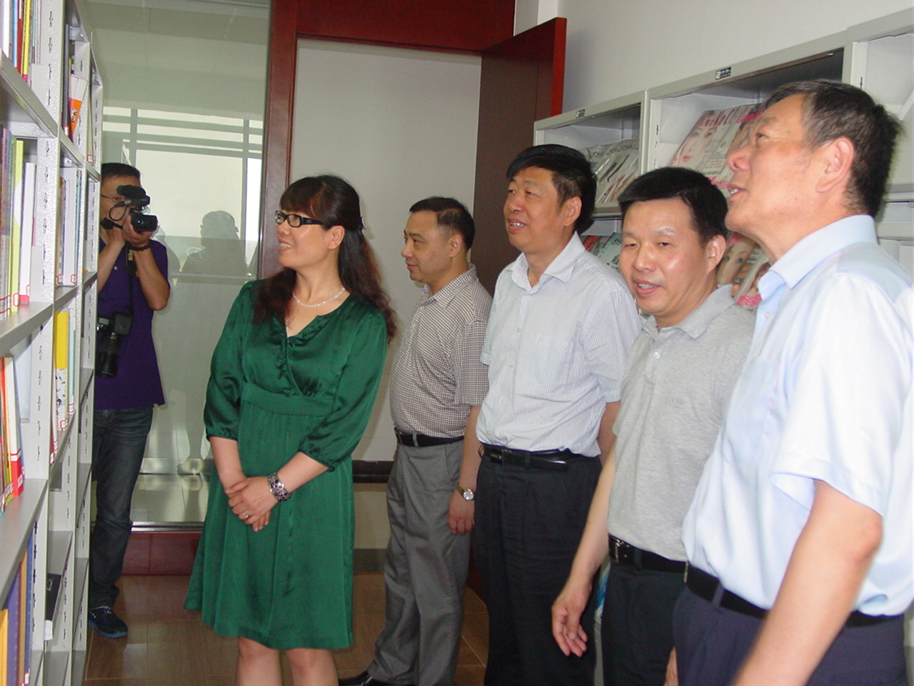 右图为杨纪朝副会长(右一)一行在市委、市经信委和公司领导的陪同下在公司图书室参观的场景。