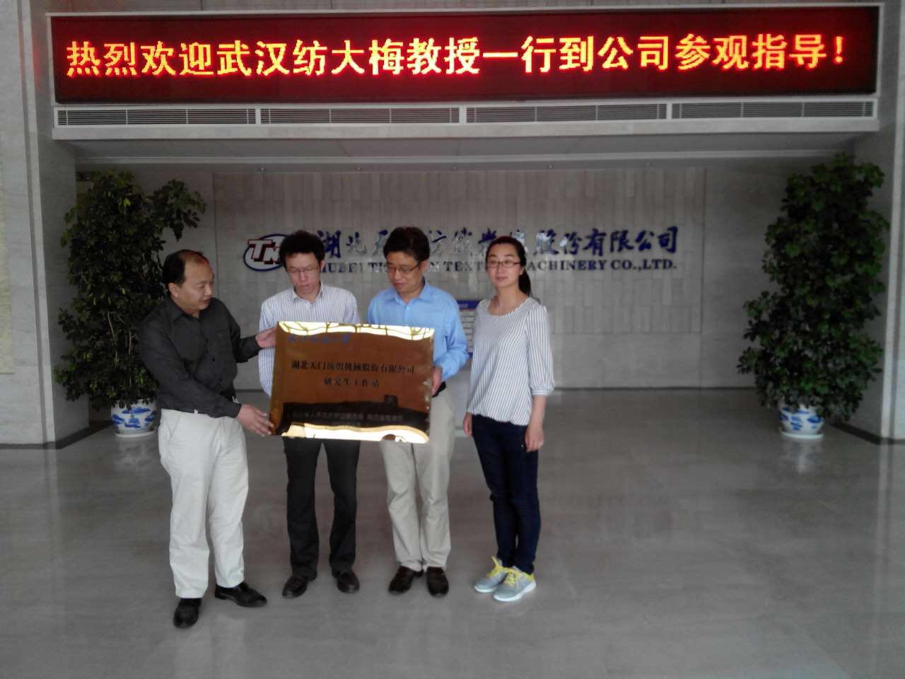 武汉纺织大学携手m88建立湖北省研究生工作站和大学生实习与就业基地(从左至右依次为院长梅顺齐、执行院长燕怒、总工程师郑强、办公室主任李静)