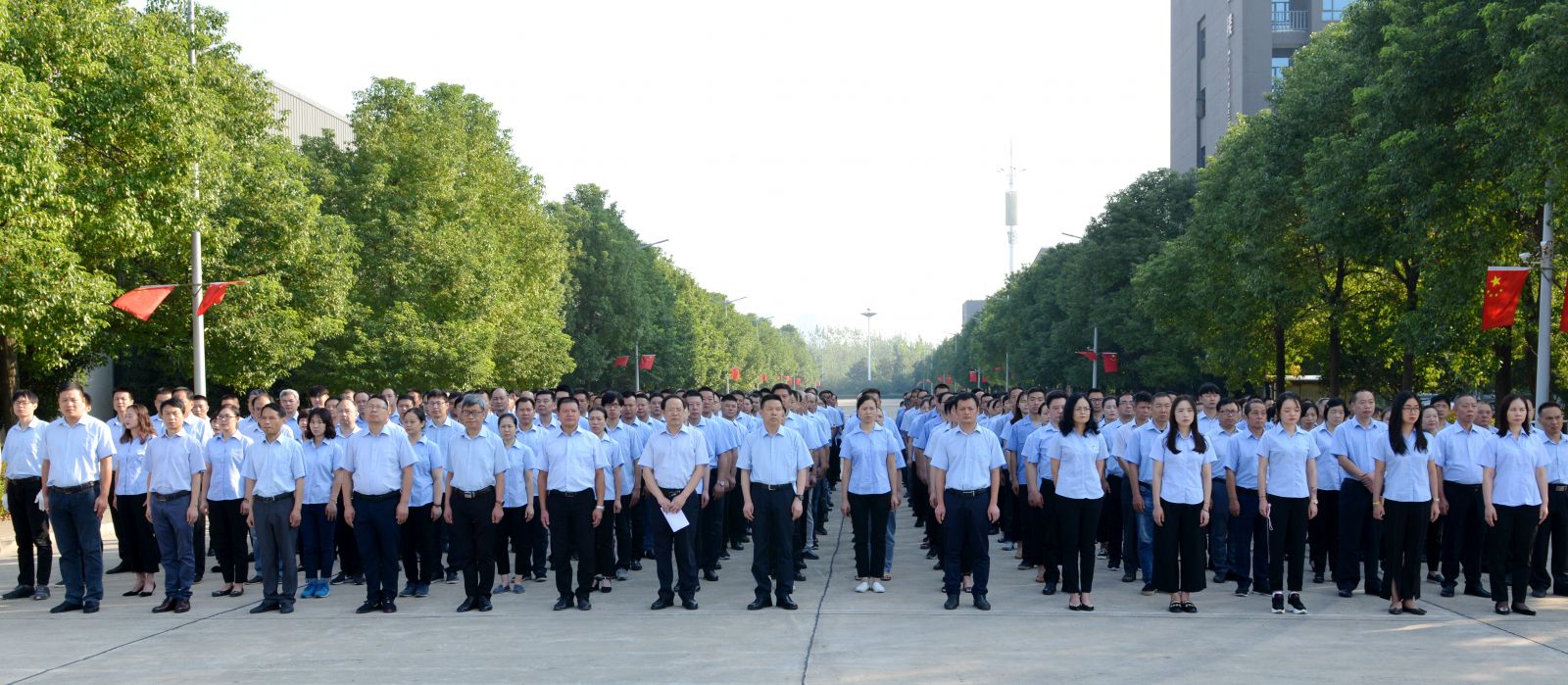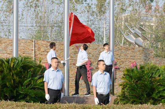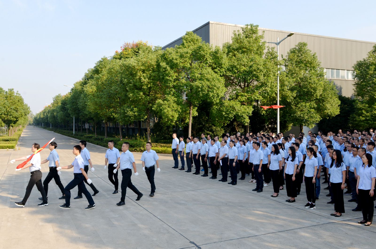 8:20时,活动仪式在总经理焦伦进的主持下启动,七名旗手迈正步从员工方队绕过,直达旗坛,行进口令威武响亮。在主持人的指令下,三名旗手将一面鲜艳的五星红旗在庄严的国歌声中徐缓地升上天空,员工方队注目国旗,唱起雄壮的国歌。