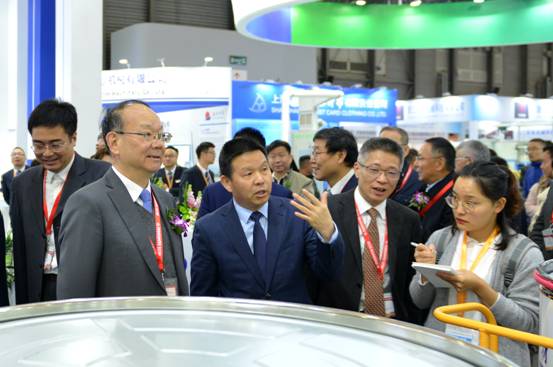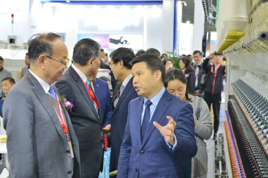 中国纺织工业联合会党委书记、秘书长高勇(左1)听取董事长沈方勇介绍参展情况