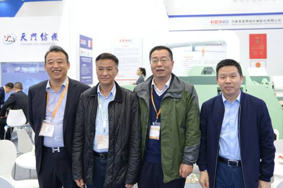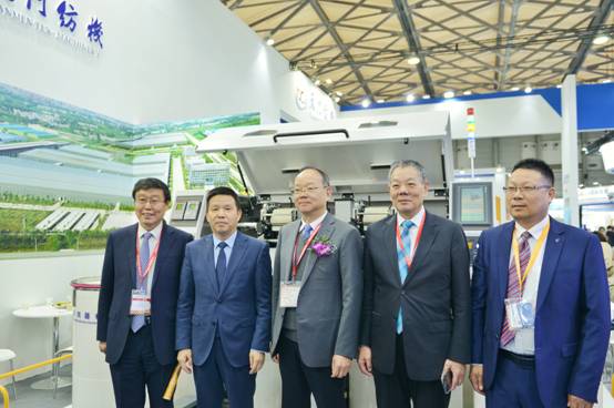 中纺联党委书记、秘书长高勇(左3)、中纺联副会长杨纪朝(右2)、中国纺织机械协会总工程师祝宪民(左1)在m88展位上合影
