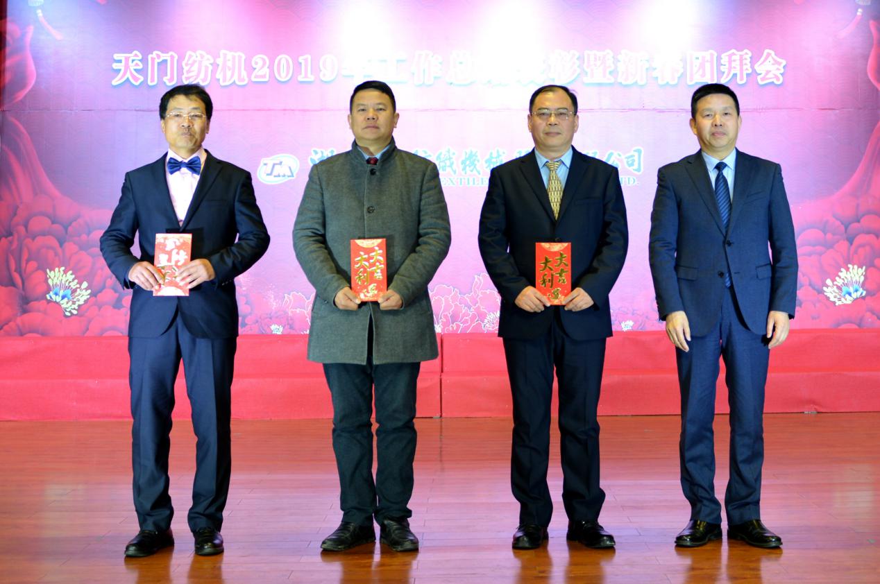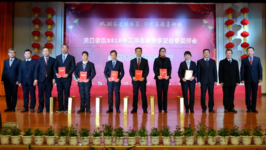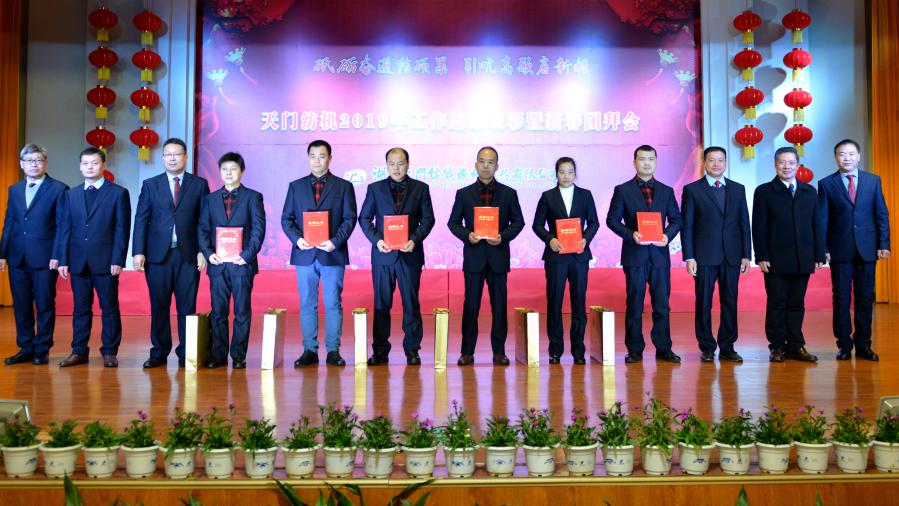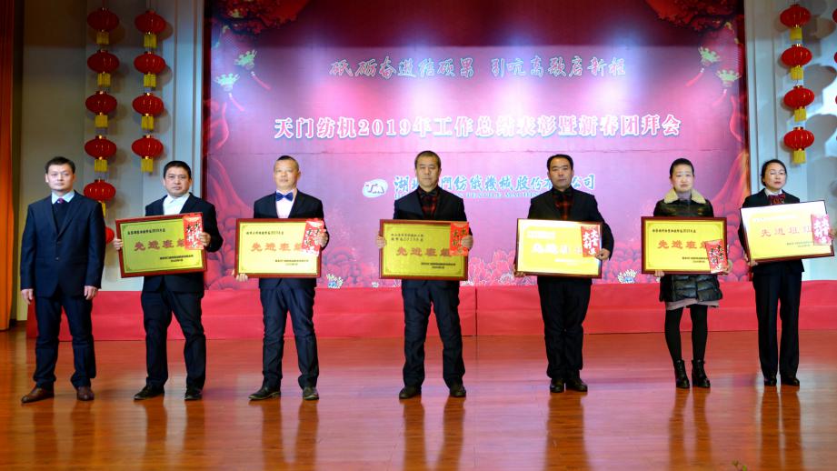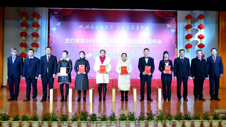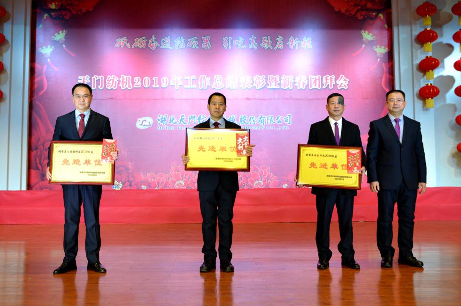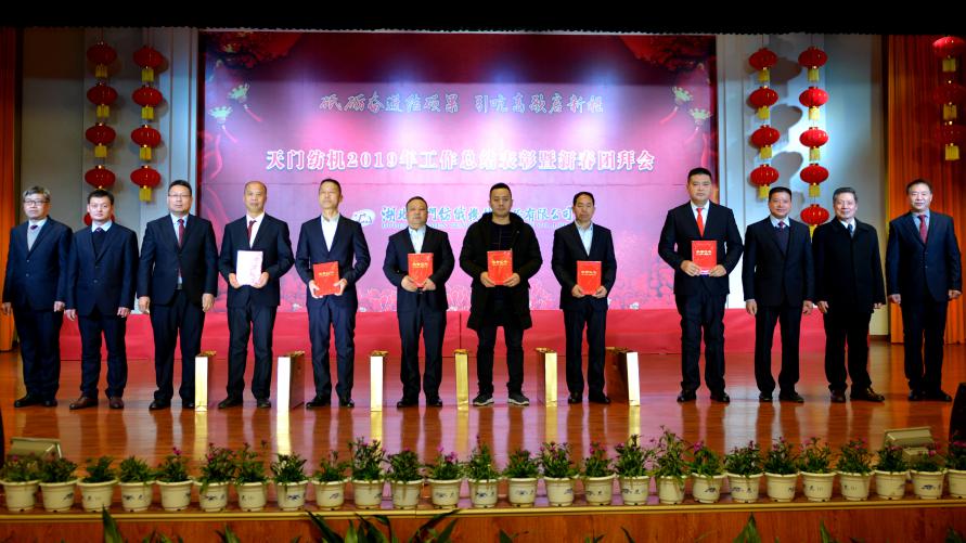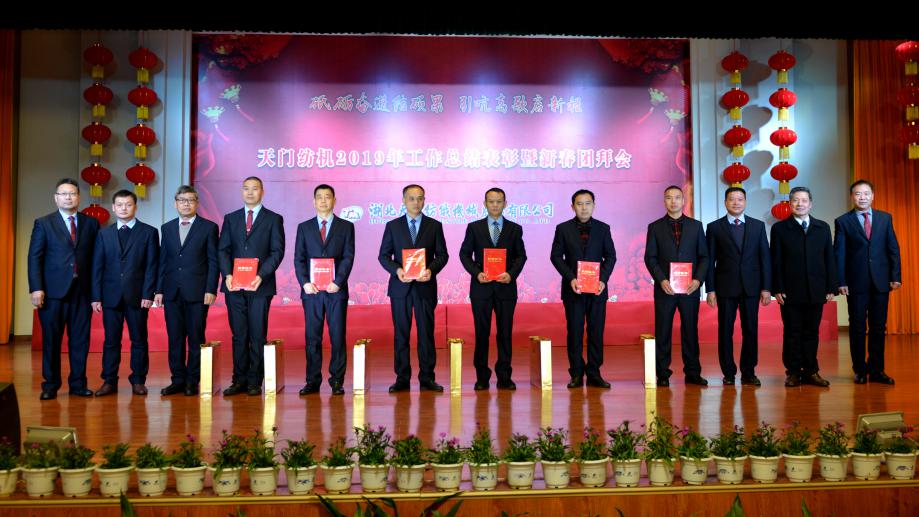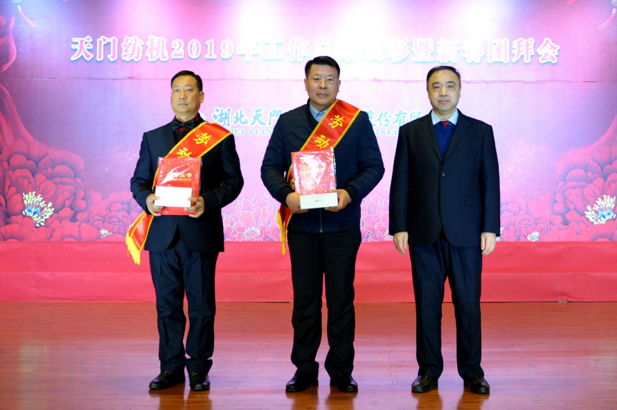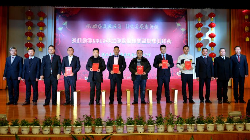 在欢快的进行曲中,受表彰的9个先进单位和44名先进个人分批次登台领奖。此外,2019年公司有3名员工获得市级以上荣誉,分别是:张立华被评为“天门市工匠”、郭升旗被评为“天门市工匠”、樊早兵被评为“中国机械工业联合会劳动模范”。公司董事长沈方勇在表彰现场对这3名员工给予了嘉奖。