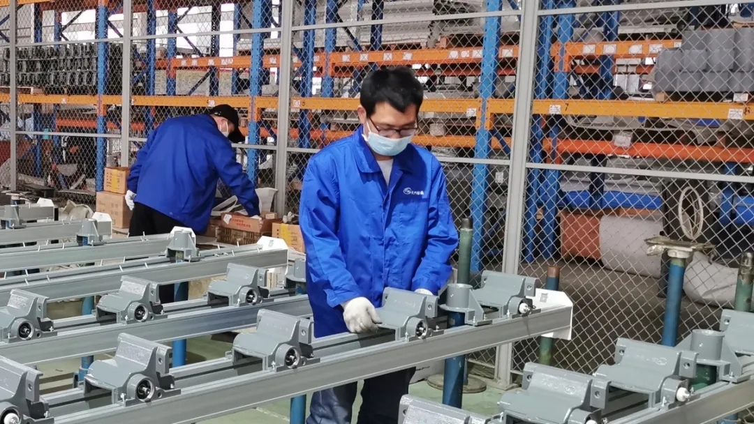 装配工曾献军对装箱的导条架进行检查
