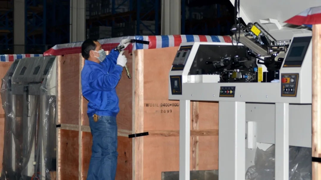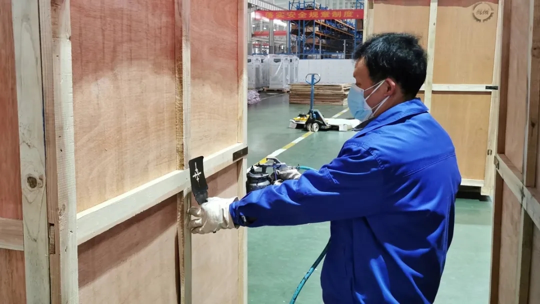 公司副总胡俊红对发货包装箱型号、标识等内容进行喷