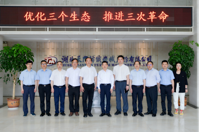 湖北省副省长肖菊华(左2)、中国工程院院士武汉纺织大学校长徐卫林(左1)、天门市委书记易先荣(右1)等领导听取公司董事长沈方勇汇报“智慧工厂”项目建设情况