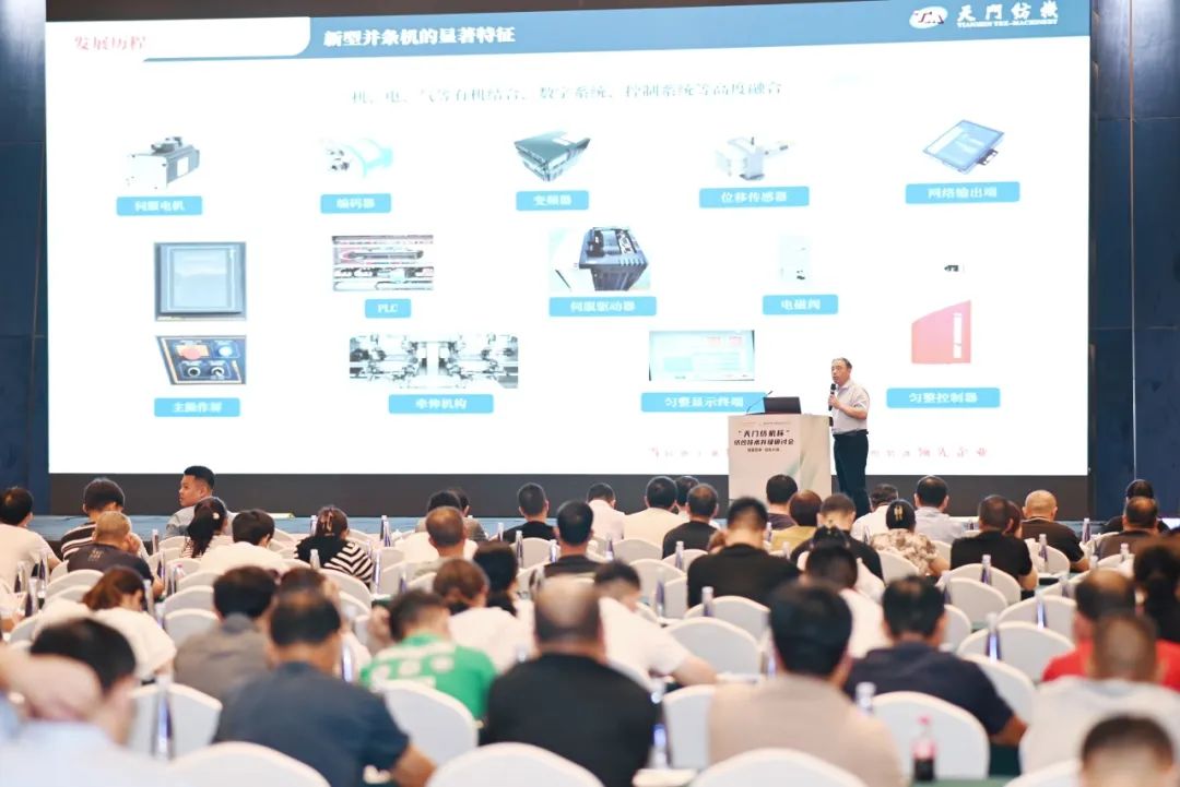 m88售后服务中心主任于少波在会议上午的技术分享环节中,作了《并条机的规范使用及常见疑难问题解决》的专题报告。他从设备操作及纺织工艺的角度,就常见问题和解决办法作了技术交流,并传授了几点要诀:一是工艺参数合理设置,确保牵伸正常;二是定期进行精确校准调整,保证各部件之间配合到位;三是建立定期维护保养制度,保证传动通道光洁;四是精心组织生产,提高设备利用率。
